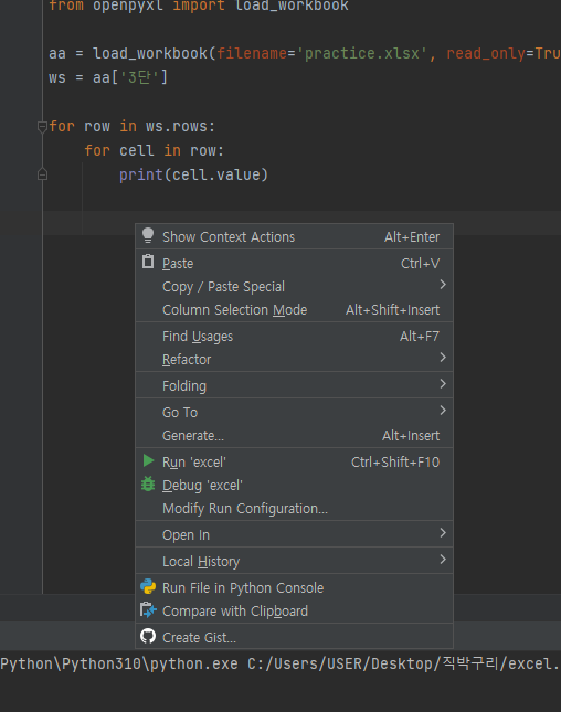 오른쪽 버튼을 눌러 Run 'excel' 버튼을 눌러주시면