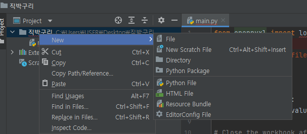 저는 바탕화면에 아무렇게나 폴더를 만들다 보니 직박구리 폴더가 만들어졌습니다. 어떤 폴더명이든 상관없습니다. 일단 폴더명에서 오른쪽버튼을 눌러 New- pythonFile을 눌러 excel이라고 이름을 지어주겠습니다. excel.py가 생겼을 겁니다. 한 줄 한 줄 코드를 가져와서 함께 공부해 보겠습니다.