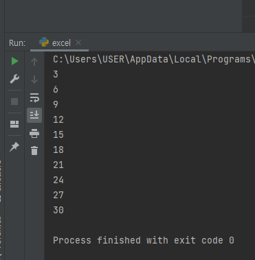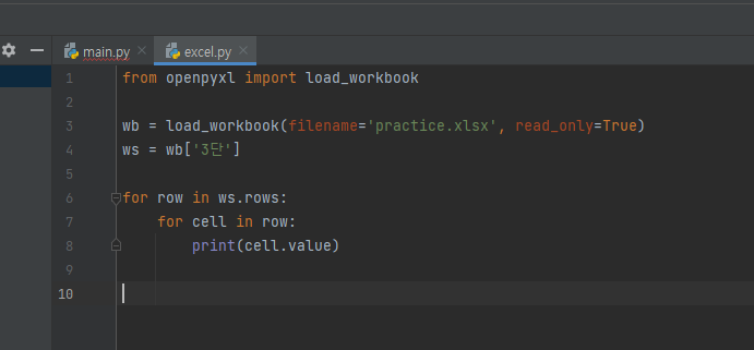 이것은 엑셀의 모든 내용을 파이썬 화면에 읽어주는 명령어라고 생각하시면 됩니다. 계단처럼 쓰인 것은 파이썬의 표현 방법이라고 생각하시면 좋겠습니다. 저 칸은 스페이스바 4칸 차이라고 생각하시면 되겠습니다. for 구문과 같은 내용들은 나중에 설명드리기로 하고 일단 위와 같이 쓰시면 엑셀을 실행하지 않고 셀간의 내용들을 파이썬일 읽어주게 됩니다.